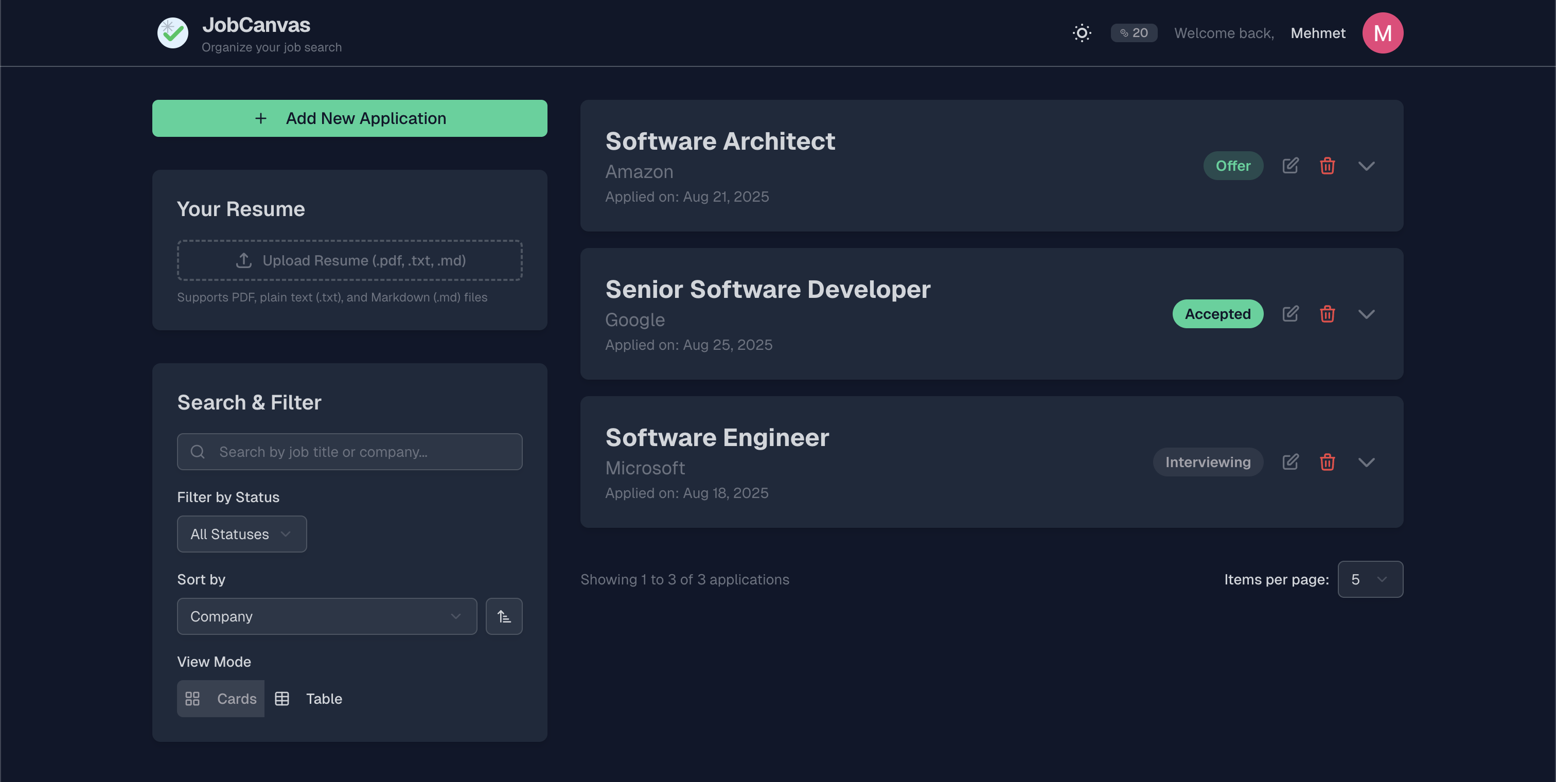 JobCanvas is an AI-powered job application tracker that helps job seekers organize their applications, track progress through different stages, and get intelligent resume analysis with match scoring and improvement suggestions.